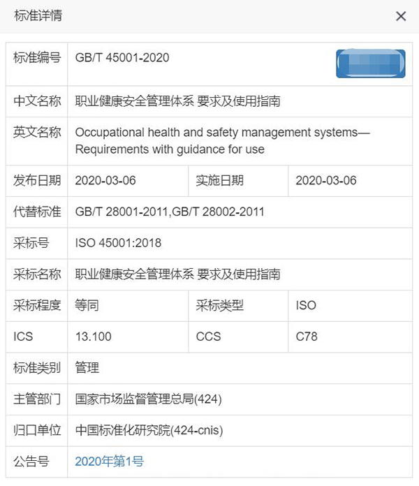 2020年3月6日,國家市場監(jiān)管總局 國家標準化管理委員會(SAC)發(fā)布2020年第1號公告,批準GB/T45001-2020《職業(yè)健康安全管理體系要求及使用指南》,該標準是等同采用ISO 45001:2018《Occupational health and safety management systems—Requirements with guidance for use》代替了GB/T 28001-2011、GB/T 28002-2011。