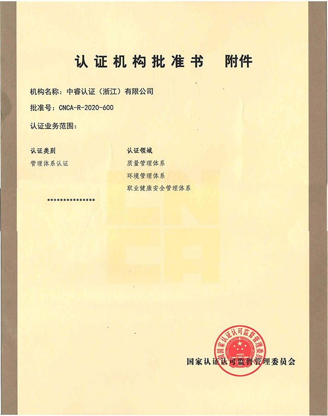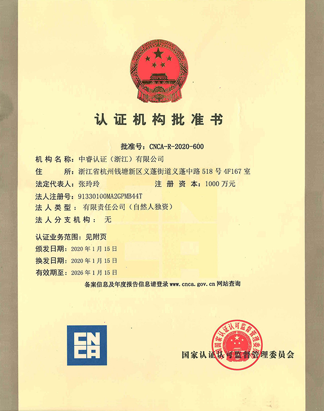 中睿認(rèn)證(浙江)有限公司正式獲得中國(guó)國(guó)家認(rèn)證認(rèn)可監(jiān)督管理委員會(huì)批準(zhǔn),批準(zhǔn)號(hào):CNCA-R-2020-600,正式成為可以從事ISO9001,ISO14001,ISO45001的認(rèn)證機(jī)構(gòu),公司致力于為企業(yè)提供增值審核服務(wù)。