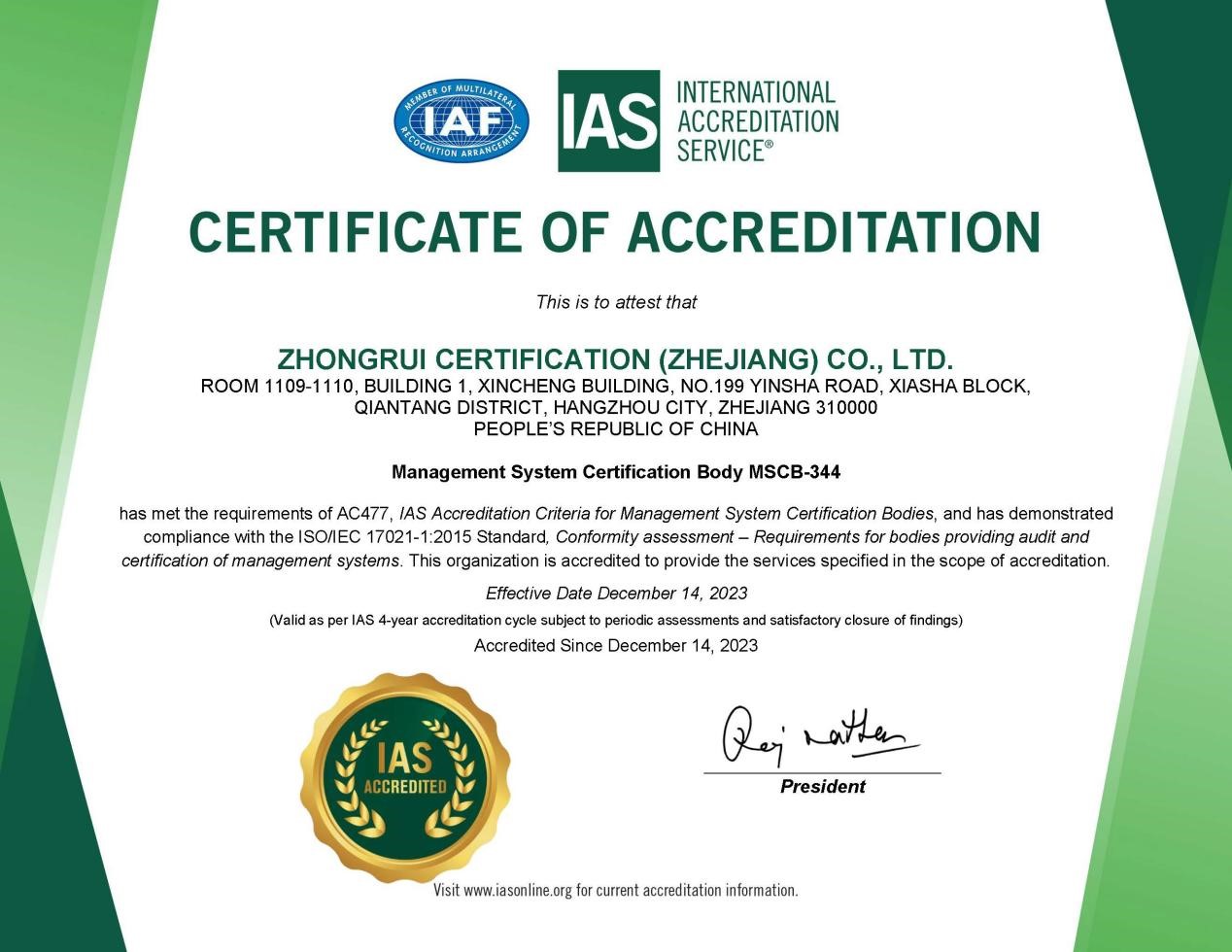 2023年12月14日,我機(jī)構(gòu)順利通過了美國權(quán)威認(rèn)可機(jī)構(gòu)IAS的質(zhì)量管理體系、環(huán)境管理體系、職業(yè)健康安全管理體系的評審,獲頒發(fā)認(rèn)證機(jī)構(gòu)認(rèn)可證書(證書編號:MSCB-344),并準(zhǔn)予在以上獲準(zhǔn)認(rèn)可的領(lǐng)域范圍內(nèi)宣傳認(rèn)可狀態(tài)、使用IAS標(biāo)識和IAF國際認(rèn)可標(biāo)識。